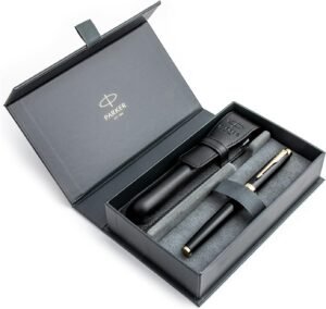 Parker IM Rollerball Pen | Black Lacquer with Gold Trim | Fine Point Black Ink | Premium Gift Box with leather Case